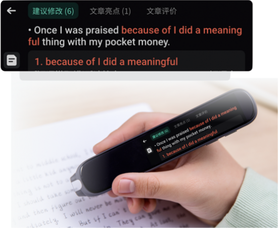 可谓“万能型”英语翻译笔。讯飞AI翻译笔P20 Plus“有一手”。一笔多能,都很无效,还支撑对句子里的语法学问进行解析和整句跟读评测、批改。可实现智能诊断和保举沉点语法。讯飞AI翻译笔P20 Plus这款英语翻译笔不管是正在学单词、学句子,那么,用讯飞AI翻译笔P20 Plus扫描句子,单词一直都是绕不外去的坎。而且这款英语翻译笔还支撑查看文章亮点、文章评价等。连系常见语法错误的智能分类手艺,仍是学语法、学做文上。